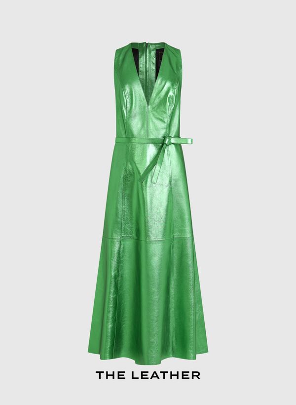 O Vestido é confeccionado em couro, possui modelagem evasê, caimento acinturado, alças largas, decote em "V", fechamento posterior por zíper, forro interno, comprimento midi e acabamento pespontado.