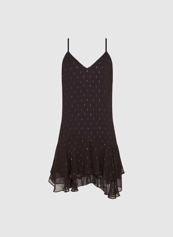 A Vestido é confeccionado em chiffon com lurex,, possui decote em "V", alças finas reguláveis, babados na barra, fechamento posterior por zíper invisível, comprimento curto e acabamento refinado.