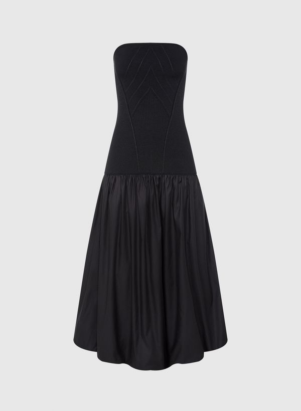O Vestido é confeccionado em tricot e tafetá, possui modelagem evasê, modelo off shoulder, saia com anca, comprimento midi e acabamento pespontado.