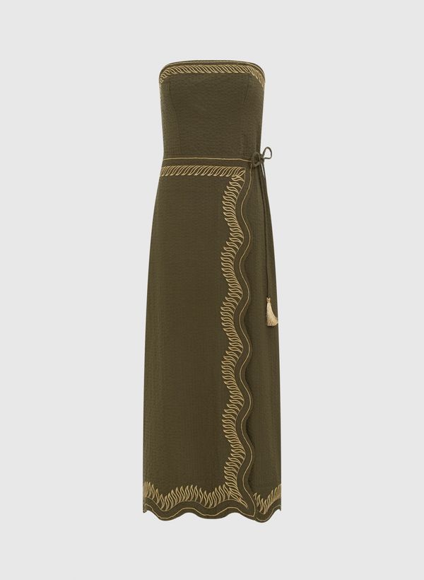 O Vestido é confeccionado em tecido plano texturizado, possui bordado maquinetado com fios de lurex, caimento reto, decote tomara que caia, cordão para amarração na cintura com ponteira de tassel, lastex posterior, barra com ondulação, comprimento midi e acabamento pespontado.