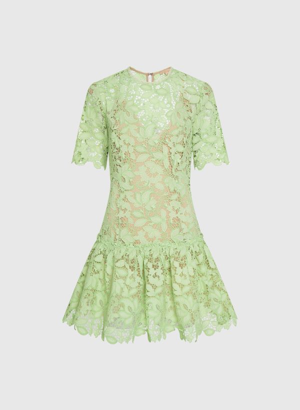 O Vestido é confeccionado em renda guipir, possui transparência, decote redondo com bico de renda, mangas curtas, fechamento posterior por zíper invisível, comprimento curto, forro tule estruturado e acabamento com o barrado do próprio tecido. A peça acompanha body.