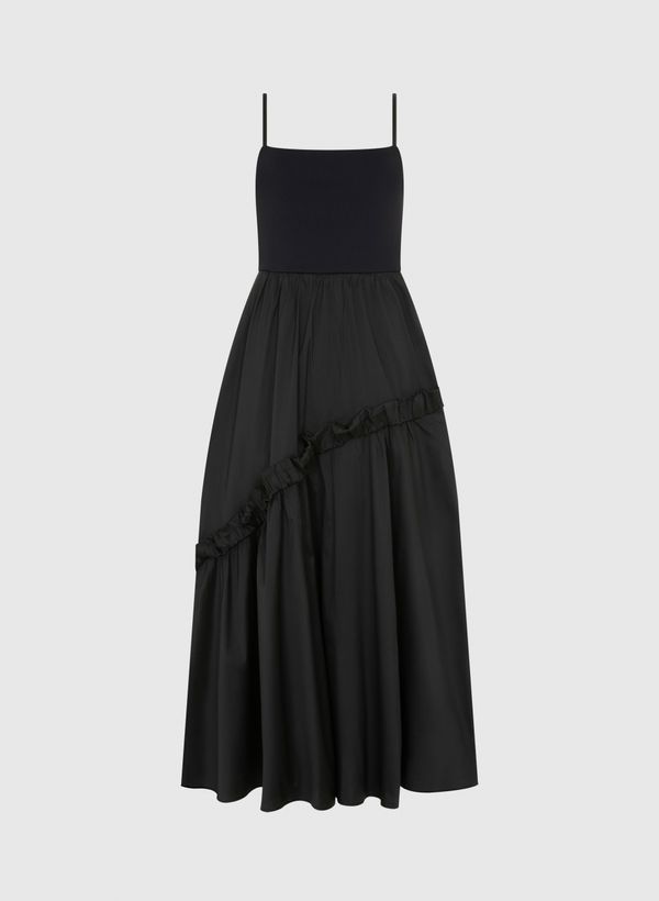 O Vestido é confeccionado em malha texturizada com tafetá, possui modelagem evasê, decote reto, alças finas com regulagem, babado aplicado em recorte diagonal, fechamento lateral por zíper invisível e comprimento midi.