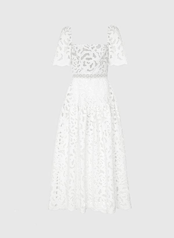 O Vestido é confeccionado em tecido plano com efeito telado, possui bordados florais em relevo, leve transparência, modelagem evasê, decote reto, mangas modelo princesa, forro interno avulso, fechamento posterior por zíper invisível, comprimento midi e acabamento do barrado do tecido.