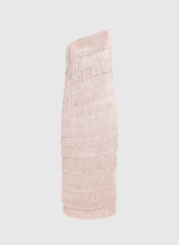 O Vestido é confeccionado em cetim com camadas sobrepostas de franjas, possui caimento reto, decote assimétrico de um ombro só, fenda lateral, fechamento lateral por zíper e comprimento midi.