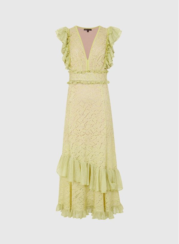 Confeccionado em tricot com fios metálicos, o Vestido possui padronagem em chevron, caimento ajustado ao corpo, decote em "V", mangas curtas com babados aplicados, babados aplicados de forma assimétrica e acabamento canelado.