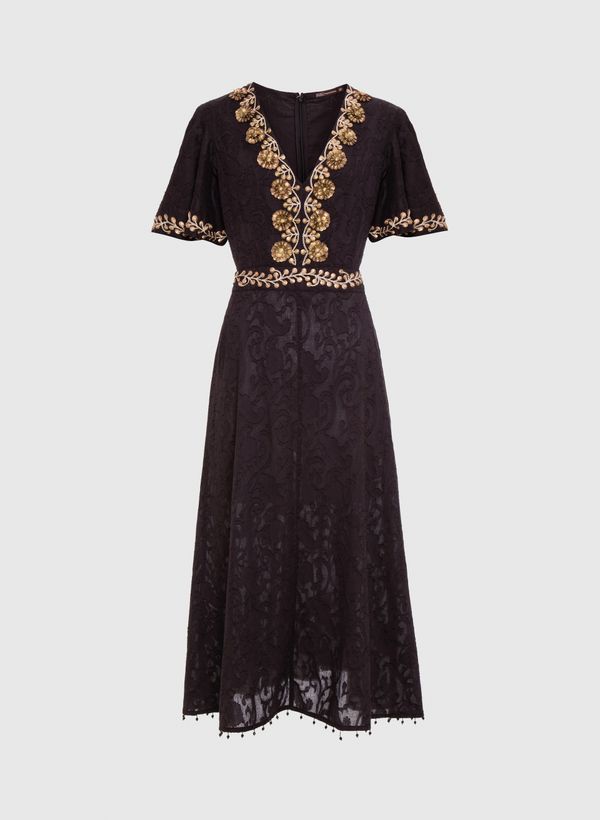 O Vestido é confeccionado em tecido plano com padronagem jacquard, possui bordado manual floral de linha com paetês metálicos, modelagem evasê, decote em "V", mangas curtas godê, fechamento posterior por zíper invisível, comprimento midi e acabamento de miçangas na barra.
