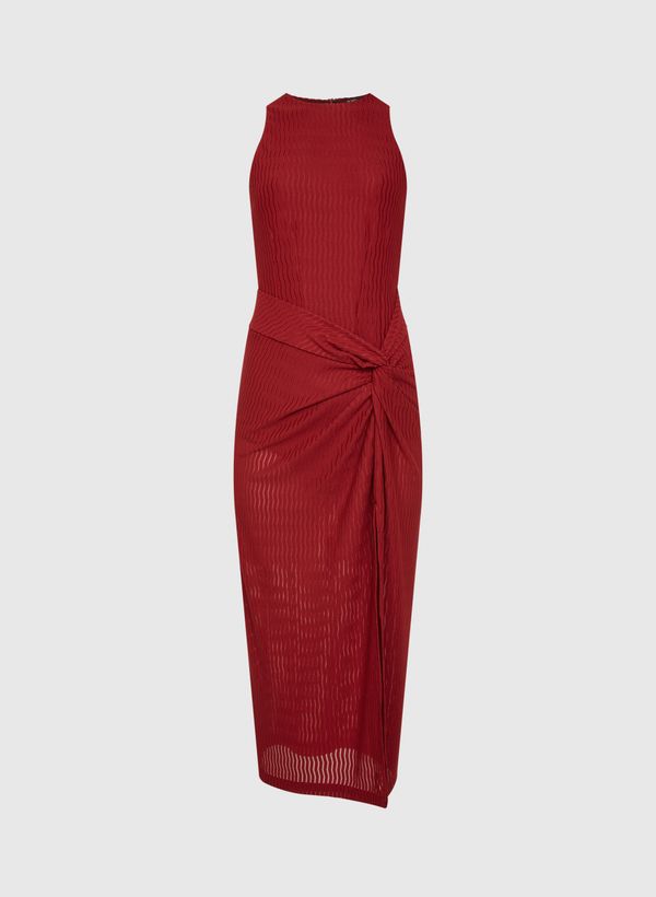 O Vestido é confeccionado em malha texturizada, possui modelagem ajustada ao corpo, decote redondo, alças largas, cintura com detalhe de torção frontal e efeito drapeado, fenda frontal, fechamento posterior por zíper invisível, forro interno, comprimento midi e acabamento refinado.