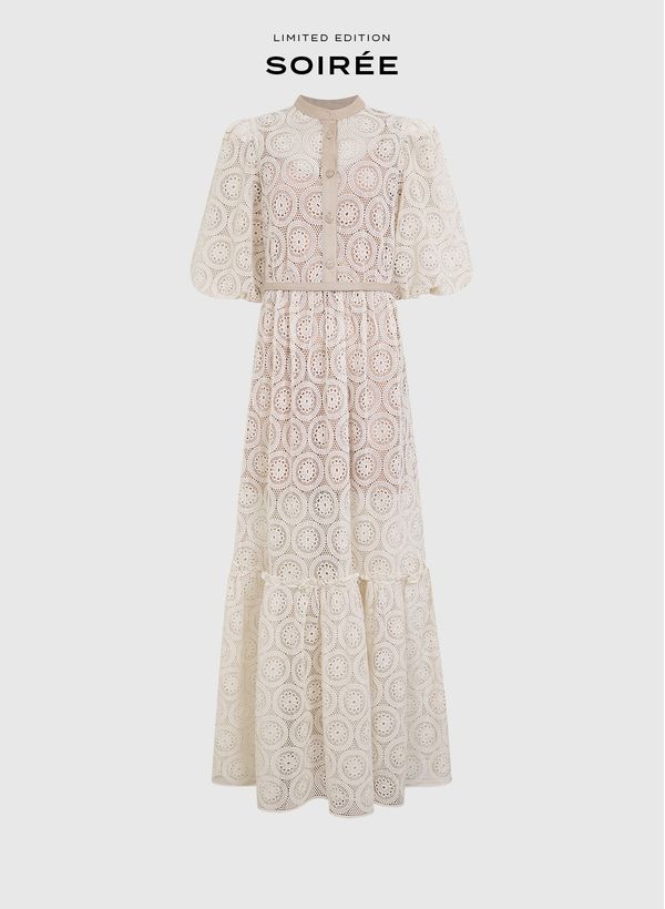 Confeccionado em renda bordada, o Vestido possui modelagem evasê, transparência, caimento acinturado, gola redonda, mangas 3/4 bufantes, detalhes vazados, fechamento frontal por botões, comprimento midi e acabamento pespontado.