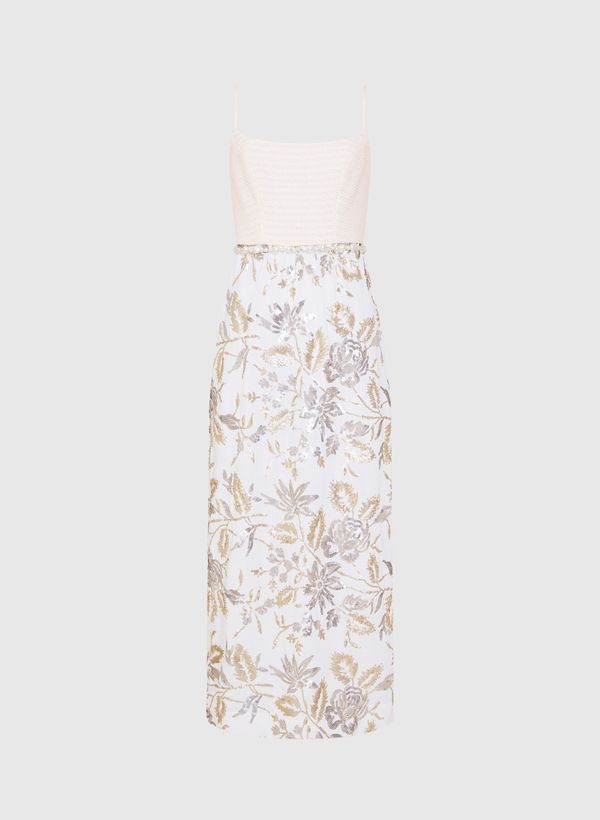 O Vestido é confeccionado em mix de tecidos, possui parte superior em raffia com mini vazados, inferior em tecido plano com bordados florais de paetês, caimento reto, decote reto, alças finas, fenda transpassada posterior, fechamento lateral por zíper invisível e comprimento midi.