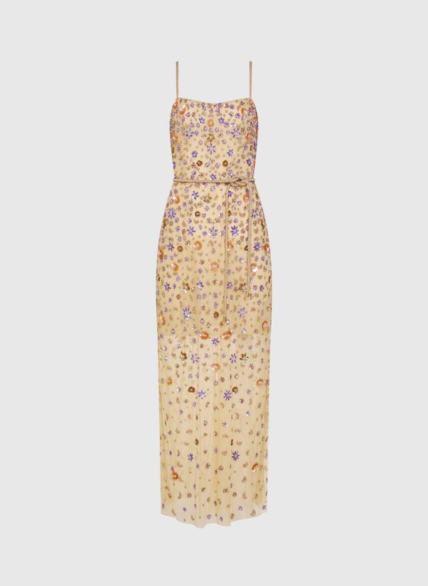 O Vestido é confeccionado em malha tule com bordado de pedrarias, possui transparência, decote reto, alças finas, fechamento posterior por zíper invisível, forro interno, comprimento midi e acabamento pespontado.