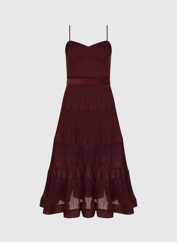 O Vestido é confeccionado em organza com plissado em camadas, possui brilho acetinado, modelagem evasê, decote coração, alças finas reguláveis, barrado com canaleta ampla com aplicação de crinol em tiras para efeito volumoso, fechamento posterior por zíper invisível, comprimento midi e acabamento pespontado.