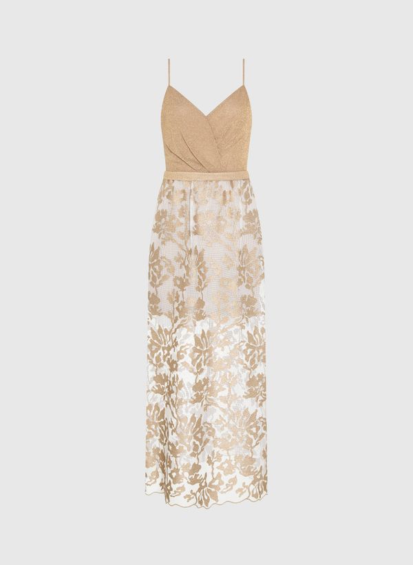O Vestido é confeccionado em malha lurex e tela bordada, possui caimento reto, alças finas, decote "V" transpassado, fechamento posterior por zíper, comprimento midi, forro interno e acabamento pespontado.